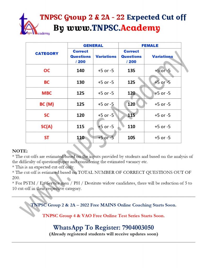 TNPSC GROUP 2 & 2A 2022 ANSWER KEY & CUT OFF TNPSC Academy 3 years ago Date of Publication of Answer Key by TNPSC.Academy: 22.05.2022 TNPSC Group 2 & 2A Expected Cut Off published : 27.05.2022 Free Registration – Register Now & Practice with Eminent Educators TNPSC Group 2 & 2A 2022 Mains – Click HereTNPSC Group 4 & VAO Online Test Series with PDF Download WhatsApp 7904003050 TNPSC Grpoup 4 & VAO பொதுத் தமிழ் இலவச ஆன்லைன் ஸ்டடி மெட்டீரியல் – Check here TNPSC பொதுத் தமிழ் book – Buy Online TNPSC Group 1, 2, 2A, 3, 4 & VAO Free Online Study Materials & Courses [UPDATED] DOWNLOAD TNPSC OFFICIAL GROUP 2 & 2A ANSWER KEY 2022 [UPDATED] DOWNLOAD TNPSC GROUP 2 & 2A ANSWER KEY 2022 IN PDF – GENERAL STUDIES [UPDATED] DOWNLOAD TNPSC GROUP 2 & 2A ANSWER KEY 2022 IN PDF – GENERAL ENGLISH [UPDATED] DOWNLOAD TNPSC GROUP 2 & 2A ANSWER KEY 2022 IN PDF – GENERAL TAMIL